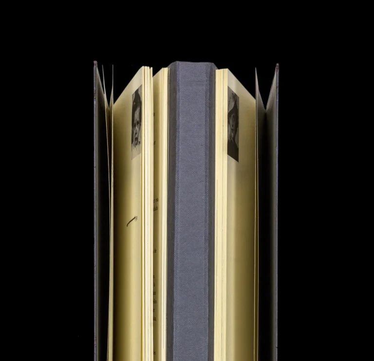 The cloth pattern features a facsimile of the author’s own family album from the 1940s. The font chosen for this project was Optima Nova by Hermann Zapf and Akira Kobayashi. The layout of the book is mirrored, making each language and line to be in parallel while reading (if the book is opened) and having absolutely no interruptions while reading one language or the other by using the middle spine (closed). When laying out multilingual content, we often try to honor both the translation and the source text.