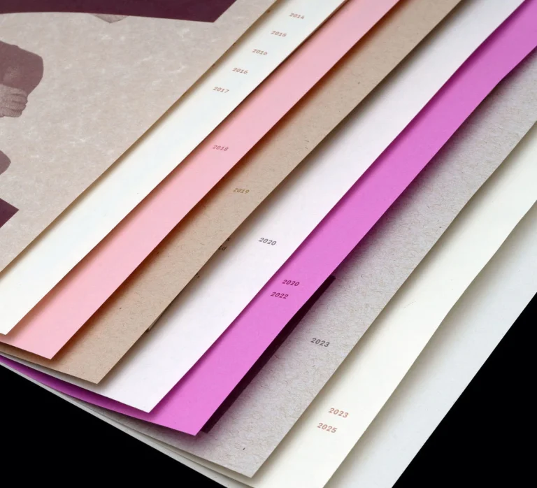 Limited edition, printed digitally in Brooklyn, bound by hand. We used ten different types of paper to create a visual, chromatic timeline.